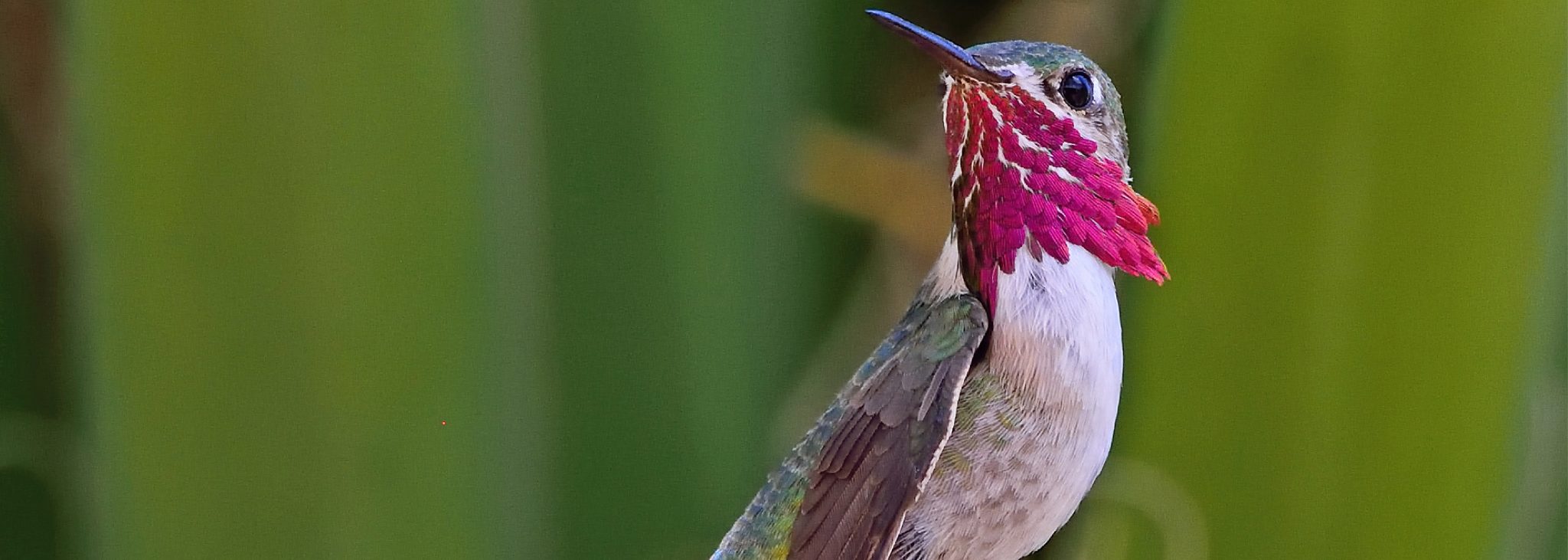 In this issue we present a small hummingbird, less than 8 cm and weighing 3 g: the Calliope Hummingbird. Males can be distinguished from other hummingbirds by their striated red throat, green back and white belly with greenish tones on the sides. Females are smaller and have short reddish tails, a finely spotted throat and a thin white line on the bill.