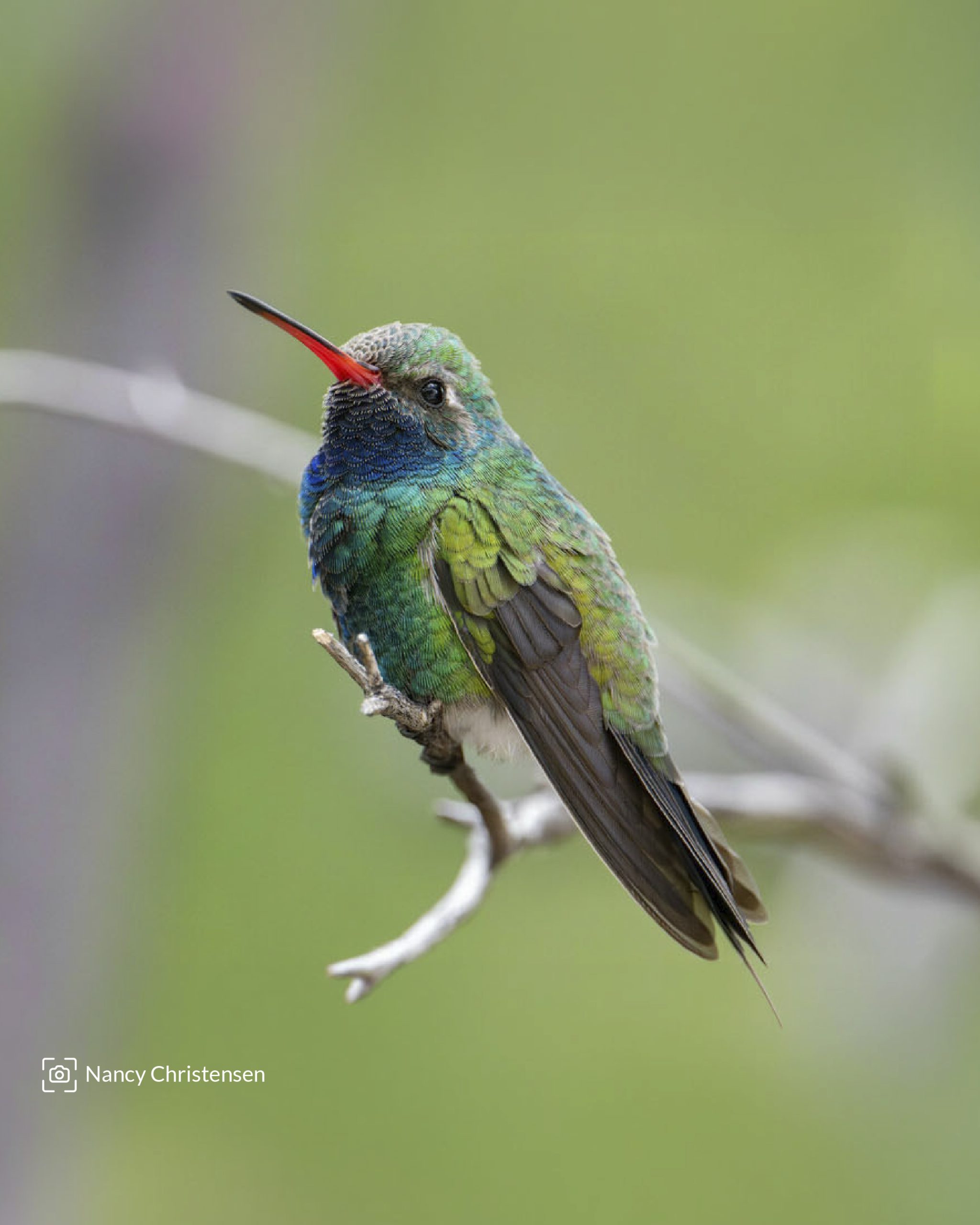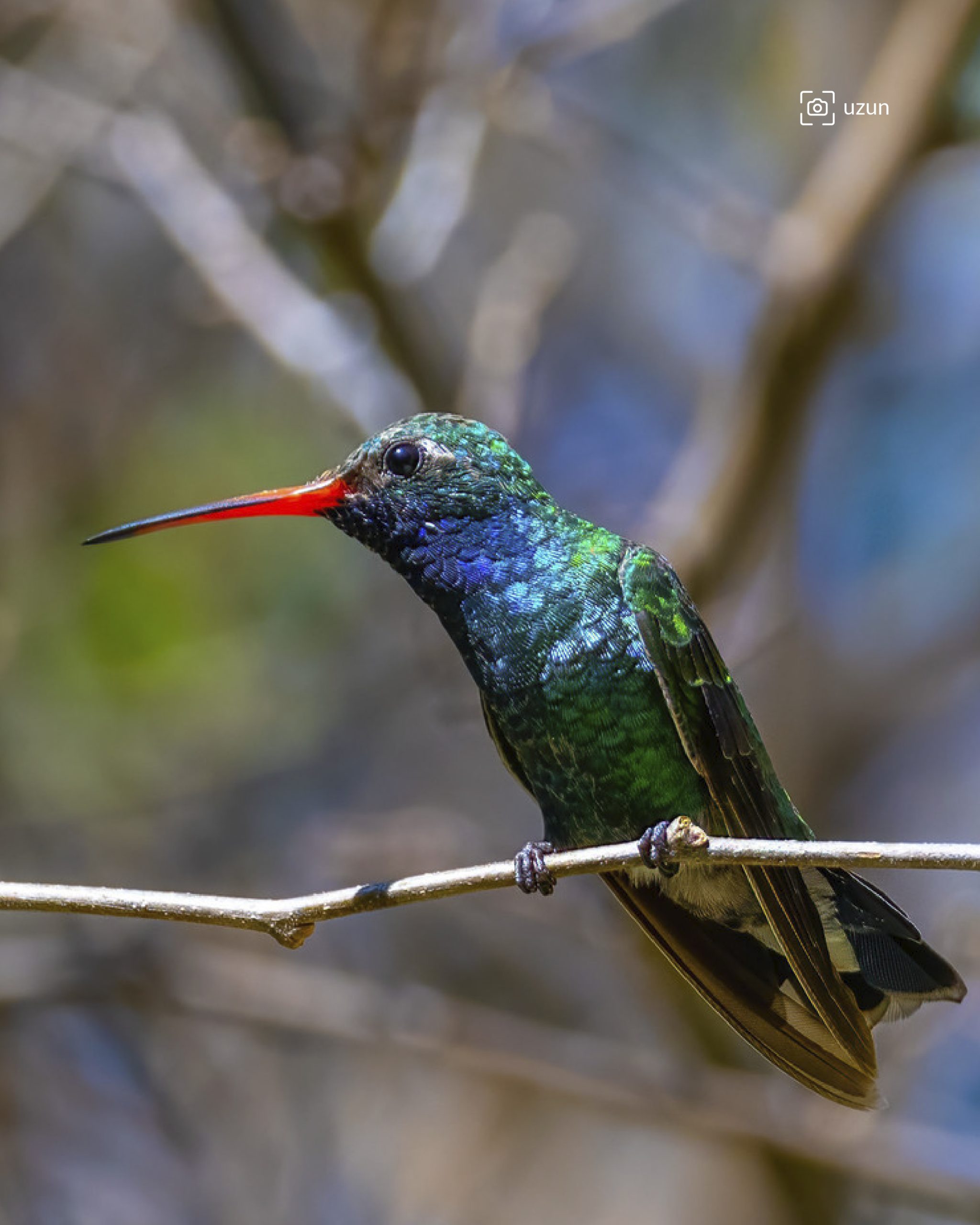 A simple vista, el macho del colibrí pico ancho norteño puede parecer oscuro. Sin embargo, cuando la luz incide sobre su plumaje, aparecen tonos iridiscentes en azul y verde que cambian con el movimiento. Su pico ancho y rojizo es una de sus características más distintivas.